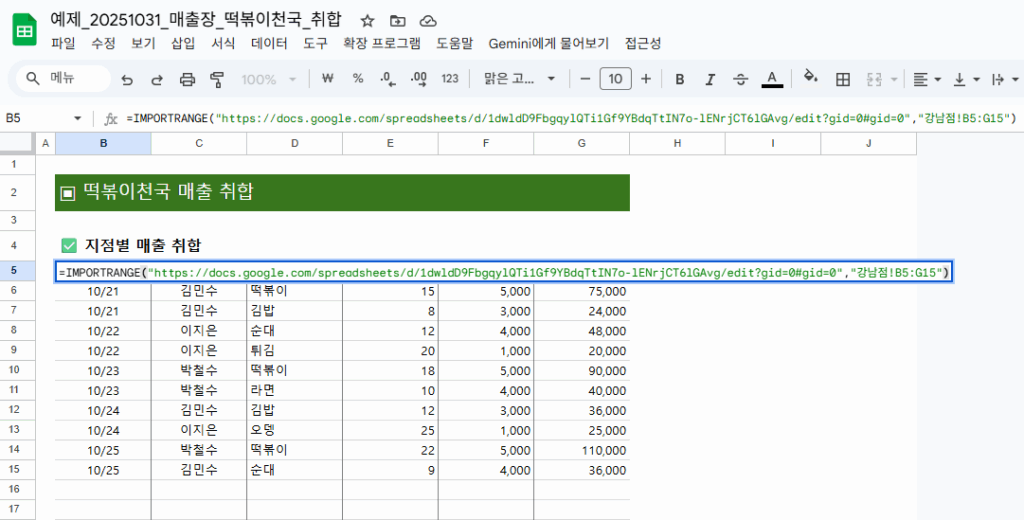 ={ IMPORTRANGE("1dwldD9FbgqylQTi1Gf9YBdqTtIN7o-lENrjCT6lGAvg","강남점!B5:G15");