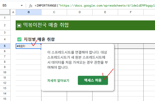수식이 입력된 셀을 선택하면, 아래와 같이 엑세스를 허용하라는 메시지가 나온다. “엑세스 허용”을 클릭한다.