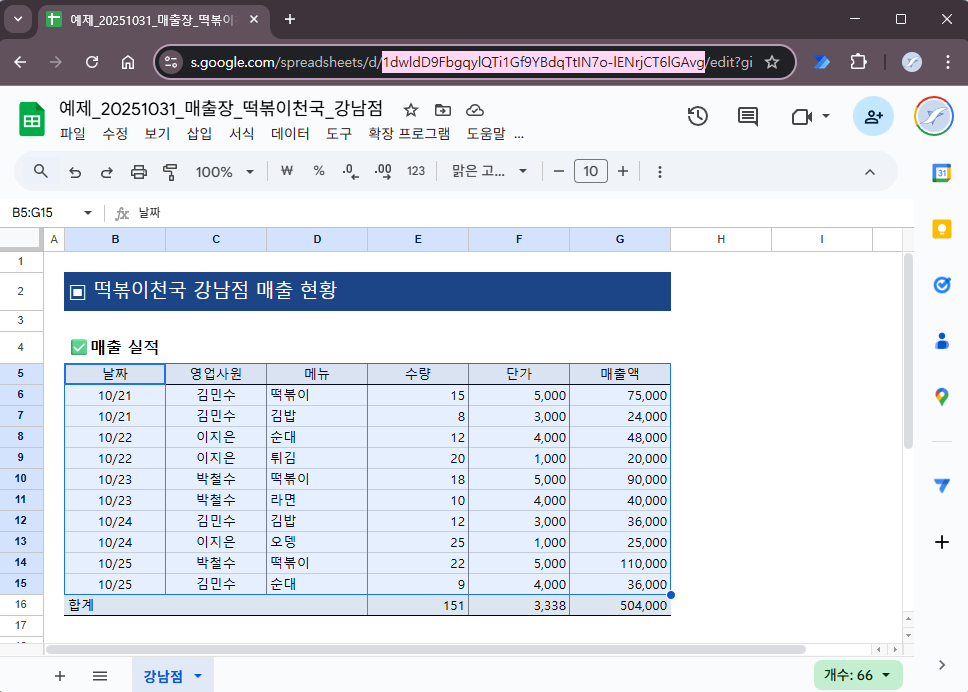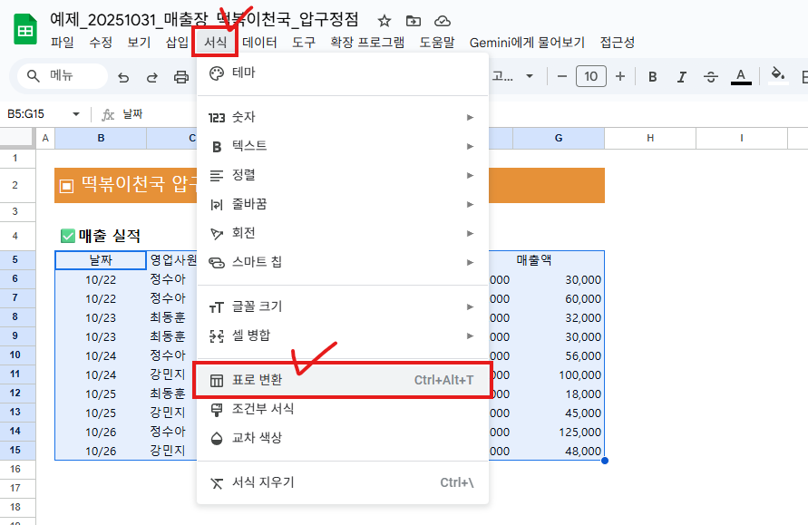 압구정점은 제목 행을 제외하기 위해서 B5가 아닌 B6부터 가져왔다.
