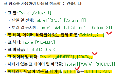 ✅ 표 영역을 참조하는 방식은 MS 도움말을 참조하자.